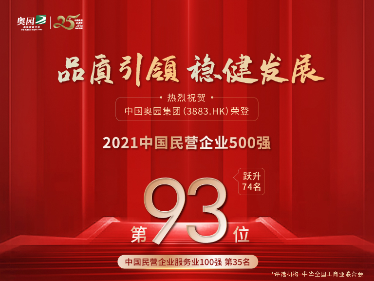 同日,全國工商聯(lián)正式發(fā)布2021年“中國民營企業(yè)500強”和“中國民營企業(yè)服務業(yè)100強”榜單。中國奧園躍居“2021年中國民營企業(yè)500強”第93名,排名較2020年勁升74位,連續(xù)四年上榜。同時,中國奧園還榮登“中國民營企業(yè)服務業(yè)100強”第35名。